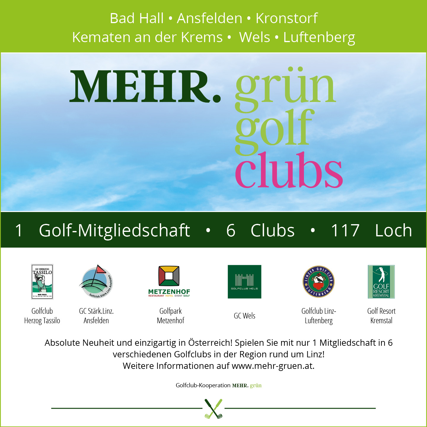 Wir sind stolzes Mitglied der Golfclub-Kooperation MEHR. grün. Die Kooperation bietet die sensationelle Möglichkeit, sich das Spielrecht für sechs starke Golfclubs im Herzen von Oberösterreich zu sichern. Hier ist Abwechslung garantiert!